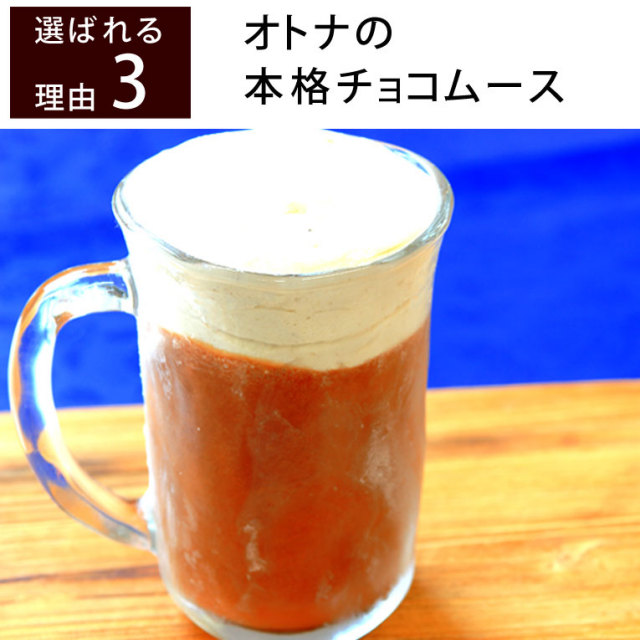 【マンゴープリン】マンゴー、生クリーム、卵、砂糖、寒天、洋酒【チョコムース】チョコレート、生クリーム、砂糖、卵、寒天、コーヒーベース、洋酒 |